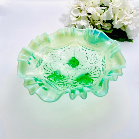 9 Antique Opalescent Green Glass Footed Bowl Northwood Etsy